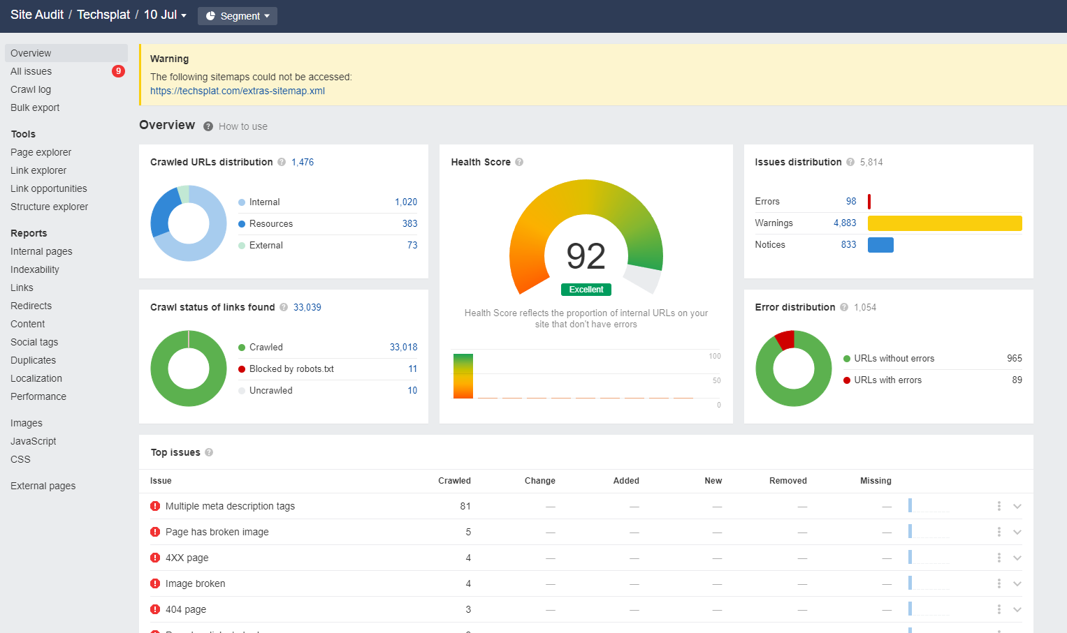 The site audit is another key part to the SEO tools and can provide invaluable information and suggestions to fix major SEO issues with a website. Both Ahrefs and SEMrush feature accurate and perceptive site audit tools, but we will check out Ahrefs first.